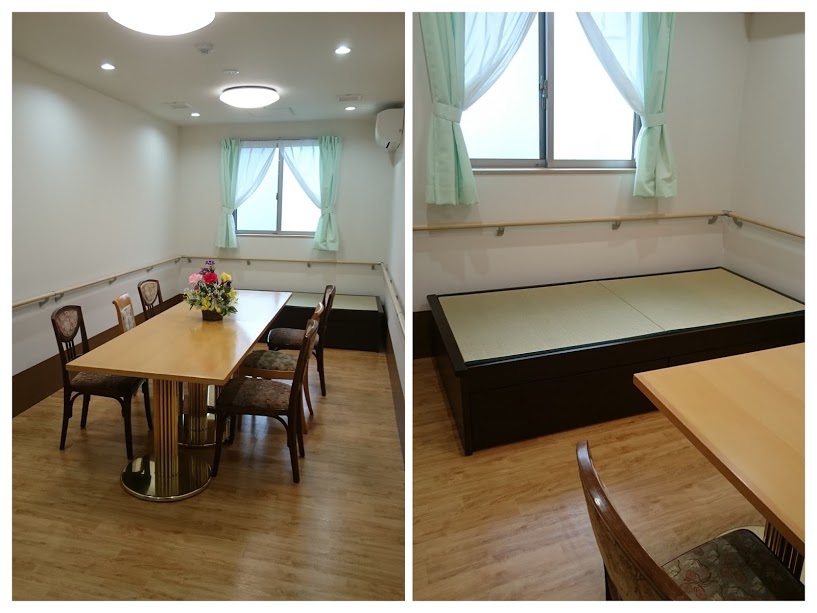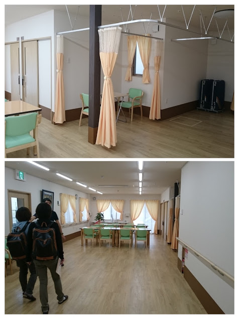 次に施設併設のデイルームにも案内してもらい、見学。定員22名でも問題ない広いスペースに今後はリハビリマシンも設置予定。デイの方は11月オープン予定だそうです。