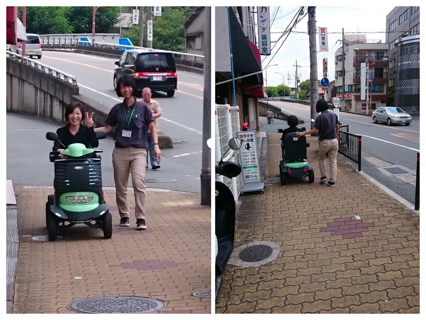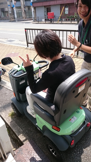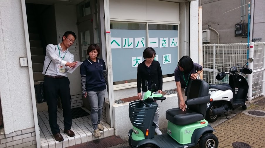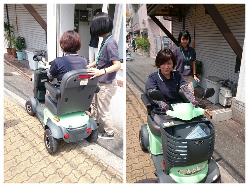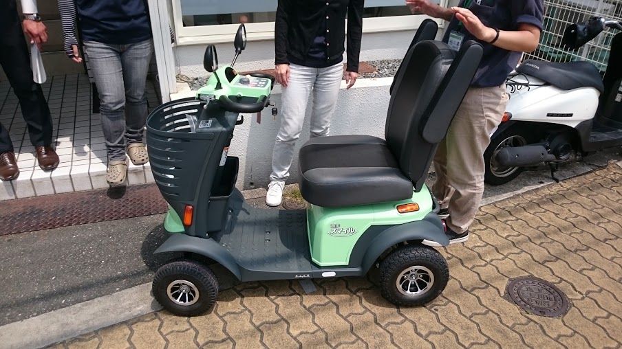 遊歩スマイル 試乗会!! 未分類 2016.08.08 夏真っ盛り!! 暑い日差しの照りつける中、株式会社セリオの森本さんと笠川さんが新商品の紹介に来てくれました!! 今回のポイントはアクセルレバーだそうです。安全と使いやすさをとことん追求!!という説明を一通り聞きまして・・・ さっそくみんなで試乗会♪ うんうん、走り出しも静かで乗り心地抜群!! ぜひぜひお薦めしたい一品です!! 時速6キロ(小走り程度)までスピードが出ます。なかなか速かったですよ♪ 小回りもバッチリききます!! 免許返納した際に、利用を検討される方も多いそうです。 居宅一同